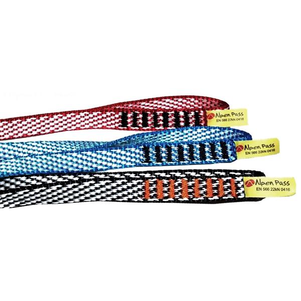 Fitas anéis costuradas para auto-seguros e ancoragens em quatro comprimentos (60cm, 80cm, 100cm e 120cm). Muito leves.
