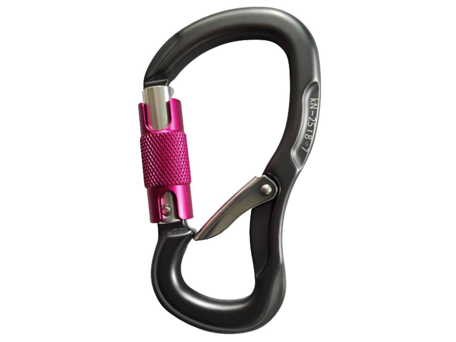 Mosquetão HMS (pera) com trava automática twistlock de três movimentos e gatilho interno que aprisiona uma alça de corda, ou de fita, próximo à sua base.