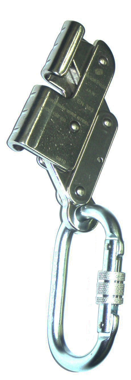 Trava quedas para uso exclusivo com cabo de aço com 8mm de diâmetro. Já vem com mosquetão oval de aço com trava de rosca Alpen Pass.