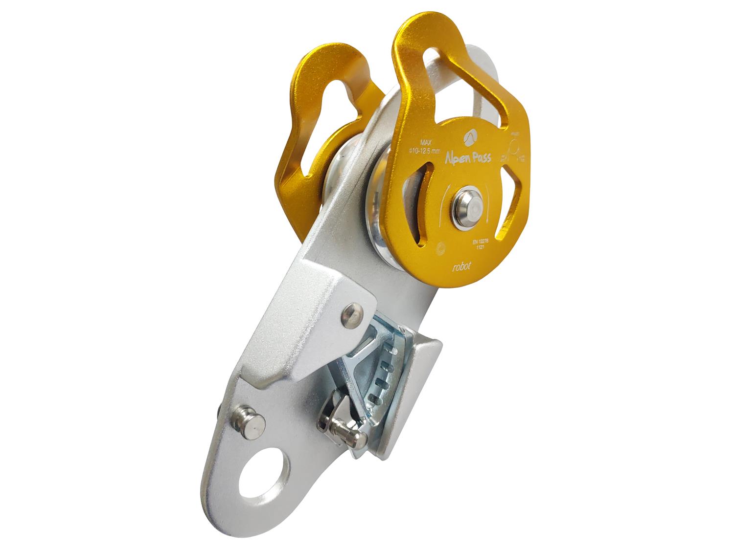 Polia dupla, rolamentada, com sistema de blocante para evitar o retorno da corda.