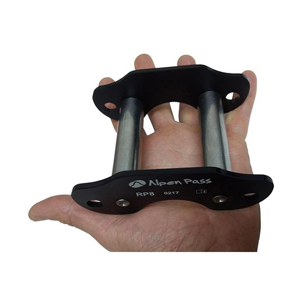 Protetor metálico para cordas, com placas laterais de duralumínio e roletes de aço inox. Já vem com duas malhas rápidas (conectores) ovais de 6mm, de aço. Construído sobre quatro rolamentos de esferas (dois em cada eixo). Como é pequeno, é muito leve e fácil de carregar, além muito prático para usar.